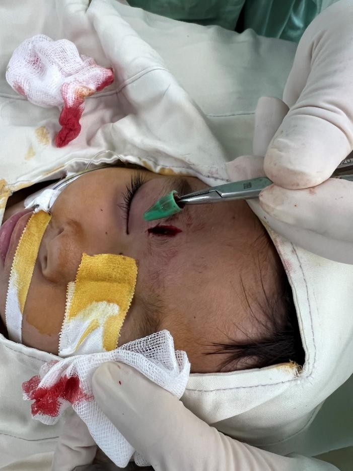 • Quá trình điều trị trước đó: Đã xử lý vết thương tại tuyến huyện nhưng tình trạng không thuyên giảm. Sau 5 ngày, mắt sưng nề nghiêm trọng, chảy mủ và đau nhức nhiều nên được chuyển đến Bệnh viện Sản Nhi Kiên Giang.
