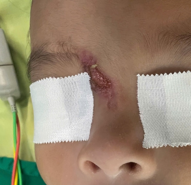 Trong quá trình phát triển, lỗ rò thường xuyên bị áp xe và chảy dịch vàng đục. Dù đã đi khám nhiều nơi nhưng tình trạng vẫn tái diễn liên tục, thậm chí có lần nhiễm trùng nặng tạo khối áp xe lớn lan rộng ra vùng mắt. Gần đây, do vị trí cũ tiếp tục sưng nề, gia đình đã đưa bé đến Khoa Liên chuyên khoa Sản Nhi, Bệnh viện Sản Nhi Kiên Giang điều trị.